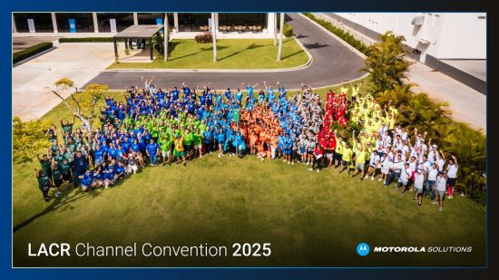 Foto aérea com centenas de participantes da LACR Channel Convention 2025 organizados por grupos com camisetas coloridas, reunidos em um espaço externo arborizado.